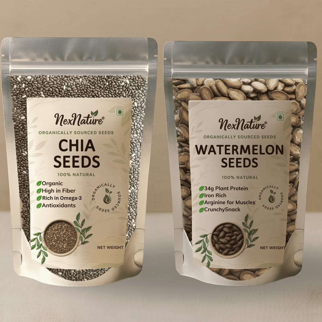 NexNature brings you a thoughtfully curated combo of Chia Seeds and Watermelon Seeds, designed to make healthy eating simple and effective. These seeds are naturally rich in essential nutrients and are perfect for adding to smoothies, breakfast bowls, salads, or baked recipes.