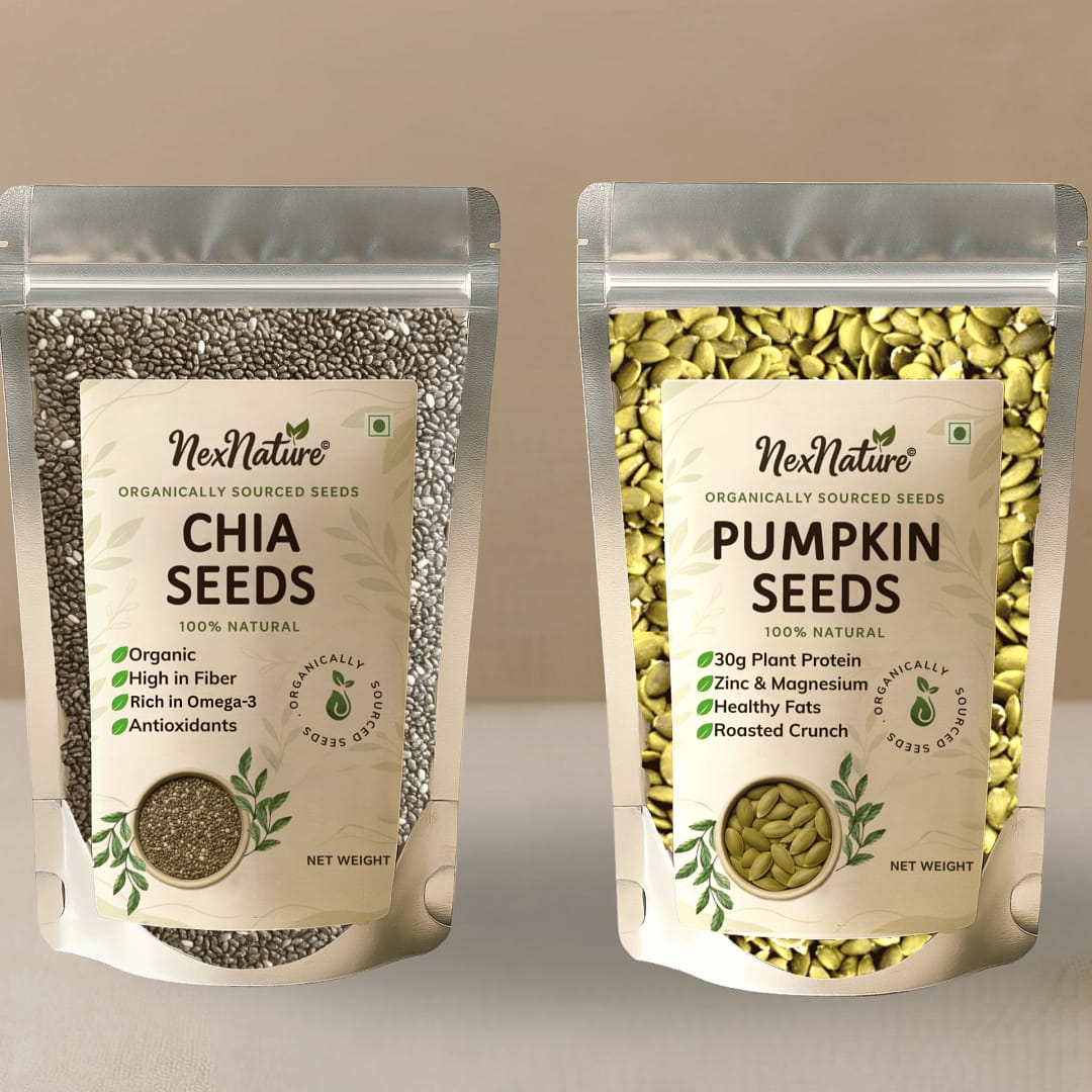 NexNature brings you a thoughtfully curated combo of Chia Seeds and Pumpkin Seeds designed to make healthy eating simple and effective. These seeds are naturally rich in essential nutrients and are perfect for adding to smoothies, breakfast bowls, salads, or baked recipes.